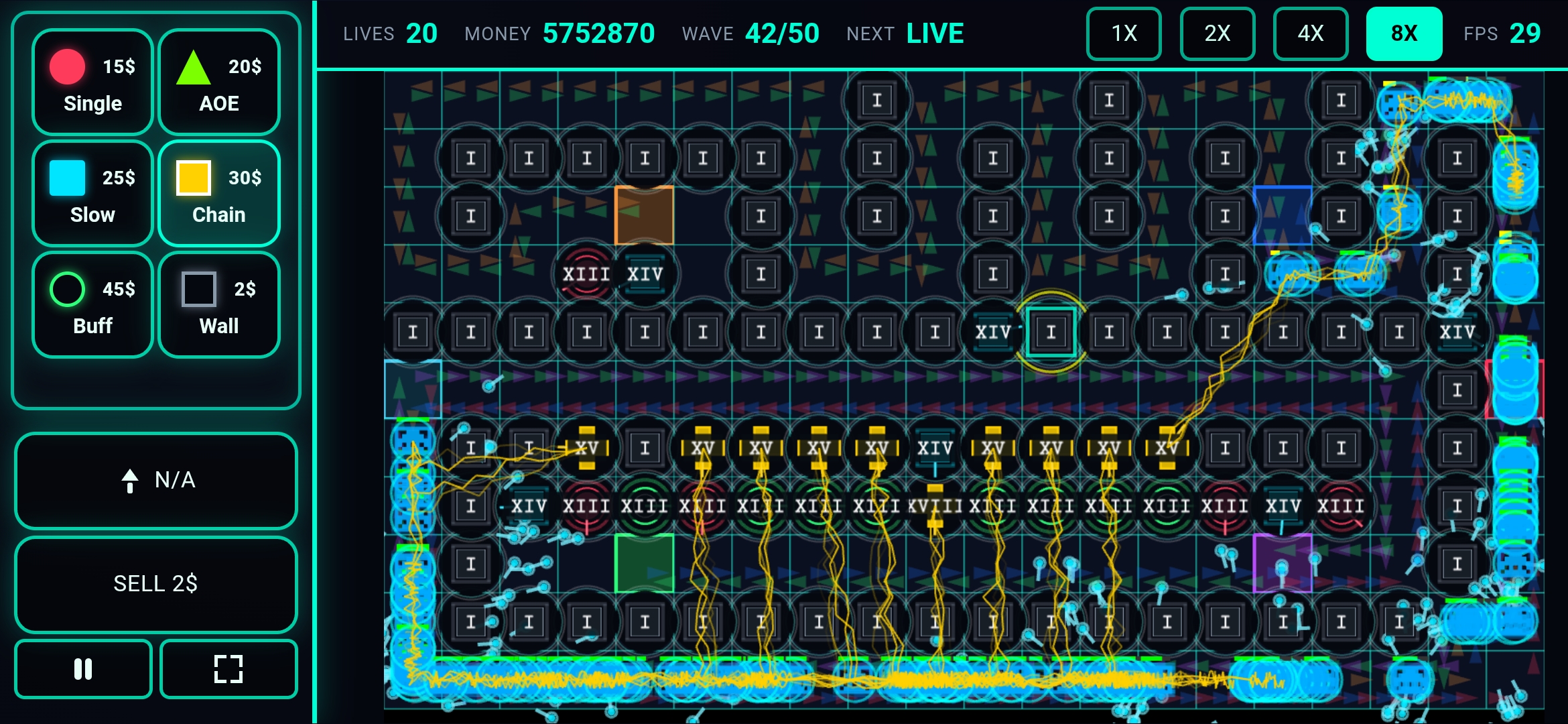 Neon grid tower defense, build towers, manage waves, and stop enemies from reaching the exit.